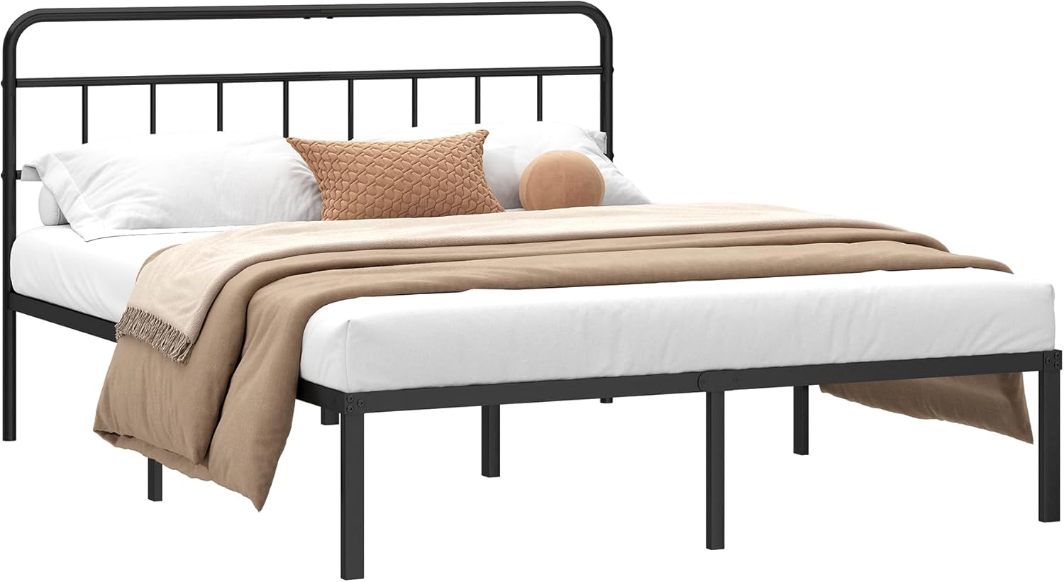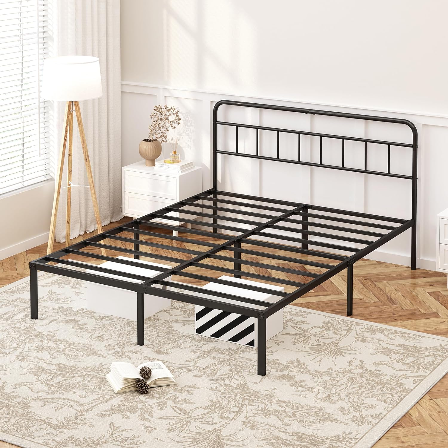 12 inches Queen Size Bed Frame with Minimalist headboard,Metal Platform Base with Strong Metal Slats,Mattress Foundation for Under Bed Storage,Easy Assembly,Black