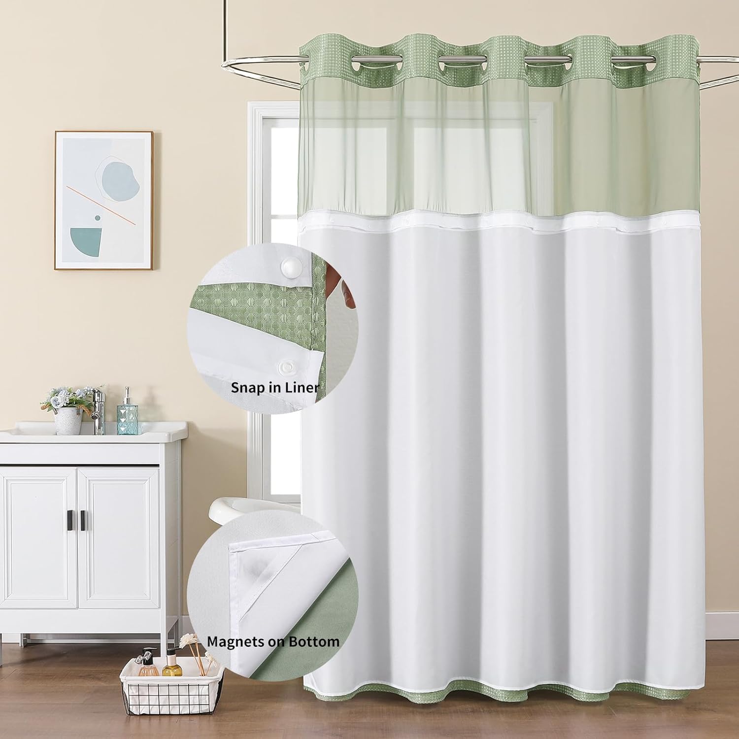 No Hook Shower Curtain with Snap in Fabric Liner, Waffle Weave Heavy Duty Thick Shower Curtains with Mesh Top Window, Hotel Style Waterproof Bathroom Curtain Set, 72” x 75”, Sage Green