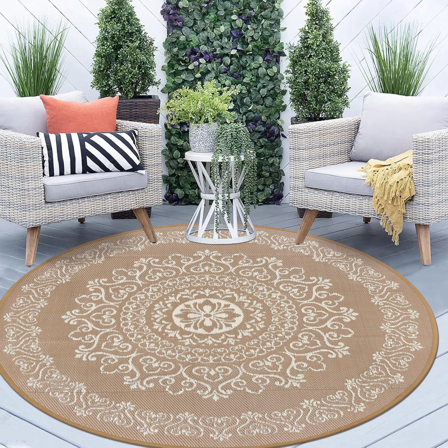 Pauwer Waterproof Outdoor Rug 6ft, Reversible Plastic Straw Patio Camping Rug, Indoor Outdoor RV Mat Carpet for Deck, Camper, Porch, Balcony, Backyard, Picnic, Floral Brown
